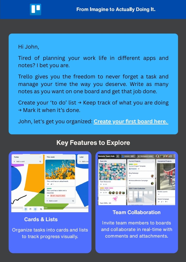 Screenshot of a SaaS Onboarding Email Design for Trello. The goal of this email is to guide users to their first “quick win” — creating their first board — focused on driving first-time user activation.