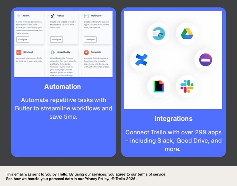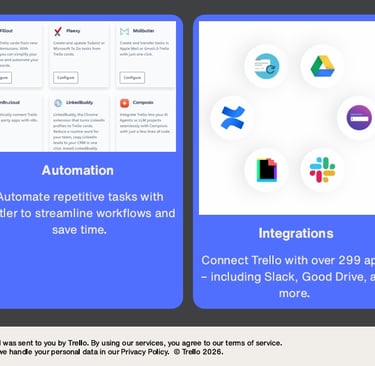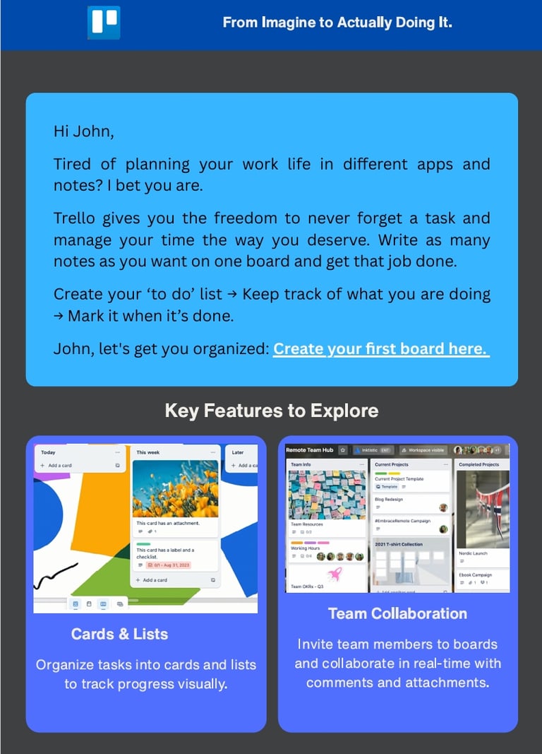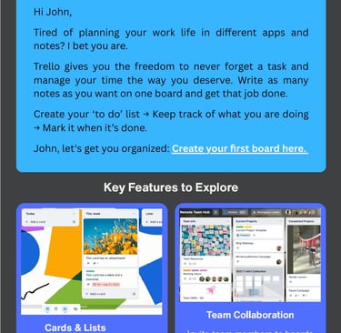 Screenshot of a SaaS Onboarding Email Design for Trello. The goal of this email is to guide users to their first “quick win” — creating their first board — focused on driving first-time user activation.